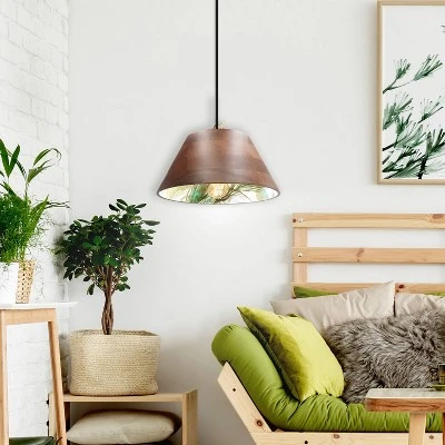 Whether you’re looking to bring some bohemian flair to your home or simply need to update the lighting in a specific room, the 13″W Nomad Wooden 1-Light Wood Pendant from River of Goods makes a lovely choice. Perfect for placing in your living room, home office or dining room, this wood pendant light features a trapezoidal silhouette for a modern look that’s given a touch of pizzazz from a peacock-patterned interior. The shade has been expertly handcrafted from horizontal mango wood pieces pressed to form, with finishes varying in shade and tone for a beautifully unique look. Included are a circular metal canopy for convenient hardwiring and an adjustable cord for various mounting height options — from a minimum drop of 15.5 inches to a maximum drop of 70 inches.