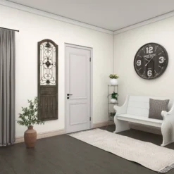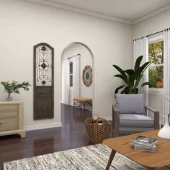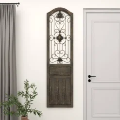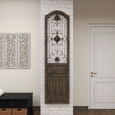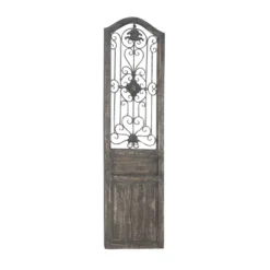 - •Wood and metal rectangular wall door panel with an arched top features a brown distressed wood finish