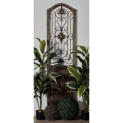 - •Brown wood and metal wall decor features a rectangular panel with an arched top and scrollwork design