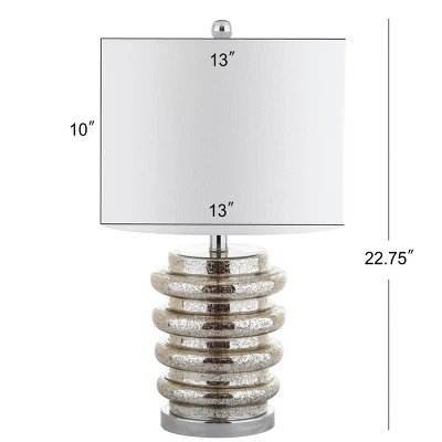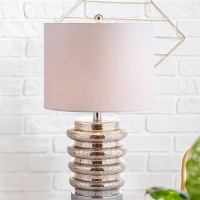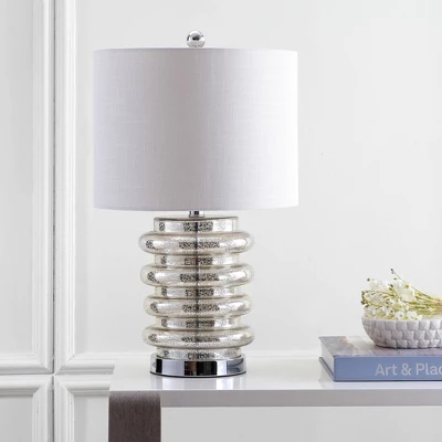 A mercury glass vessel with variegated ribs dazzles in this silver patina finish. A futuristic design in silhouette, the addition of a classic silver finish warms this style with traditional ease. The design features a silk-wrapped cord and chrome finial, while up top is a white fabric drum shade. Mercury glass gets a modern update in a variegated glass silhouette. 100% cotton hardback drum shade. Beautiful to display or easy to conceal: the 60 cord is silk-wrapped. On-off rotary switch on socket. Takes one maximum 100 watt or equivalent bulb (one LED bulb included). Eco-friendly 9W LED bulb included. UL Listed. Before cleaning any lamp shade or fixture, disconnect the power source. Wipe with a soft, dry cloth. Avoid the use of chemicals and household cleaners as they may damage the finish.