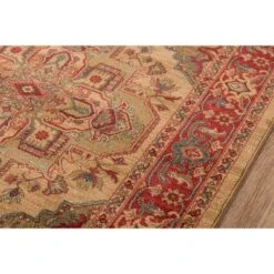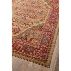 The ornamental elegance of this traditional area rug has deep roots in old world design motifs. Evoking the timeless visual elements inspired by classic Kazak carpets, an eye-catching geometric field of medallions, palmettes and flowers is surrounded by an intricate border in regal shades of crimson red, blue and gold. With references to centuries-old Heriz and Serapi rug patterns, each elaborate rug design is elegantly crafted from soft synthetic fibers, while power-loomed precision ensures this traditional floorcovering will truly stand the test of time.