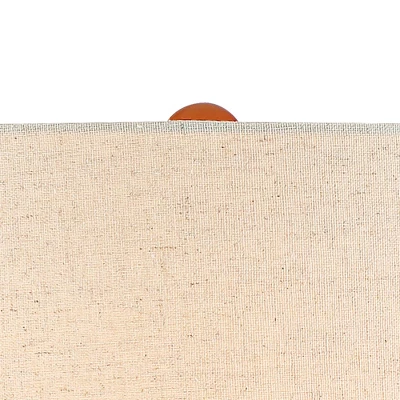 - Warm red oak finish wood neck and bottom. Off-white fabric cylinder shade. 7-foot long black cord and plug.