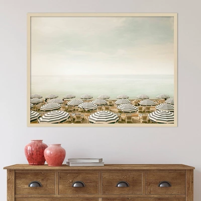 The pale aqua color of a still and peaceful sea is contrasted by multiple rows of navy and white beach umbrellas and lounge chairs spread out across the sand. Sunbathers can be seen taking advantage of the sunny day. This Amanti Art decorative framed art piece is a home decor item you can be proud to showcase on your wall. Our craftsmen handmake this piece in a small custom art and frame shop in America’s heartland. We know that each decoration you choose for your home, be it for your living room, foyer, kitchen, bedroom, bathroom, or other space, is a reflection of your style and taste. We hope you’re pleased with your Amanti Art purchase!