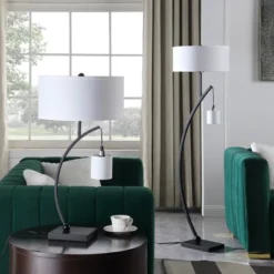 The Contempory dual of this floor lamp could just as easily reference what happens to people who see it up close for the first time – they stop as they consider the careful balancing act performed by metal-forged into gentle curve and counterbalanced by the pendelum reading lamp. Illuminate your decorative taste with this metal forged Arc floor lamp. Beautify your home or office with this transitional floor lamp, simple yet impactful design elements provide the perfect balance of form and function. Finished in a matte black finish, and featuring a soft white dual drum shade, the arc supporting arm of Structure allows for focused yet out-of-the-way illumination for reading or other deskside tasks. The single light model rests at 59 inches in height and features an additional reading light for a desktop space-saving footprint. The dual light model provides just the right amount of ambient light to illuminate your workspace to a side chair or floor living spaces.