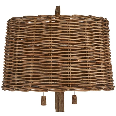 This rustic lamp design was inspired by the great outdoors, the majestic Sequoia tree. The resin lamp body is crafted to resemble a strong and enduring tree trunk, and comes in a faux wood finish. A brown wicker drum shade on top is the perfect accent to this rustic design. The design takes two light bulbs, each of which can be operated by a pull chain that resembles a rough plug of wood.