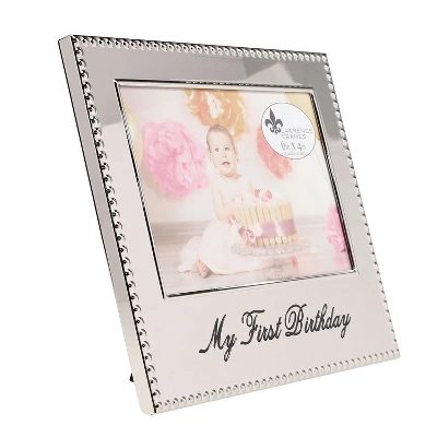 4×6 My First Birthday Picture Frame Horizontal tabletop display. Wipe clean with dry cloth, glass included. Holds 4 inch by 6 inch horizontal photo. Gorgeous high polished silver finish. Sold as 1 Each.