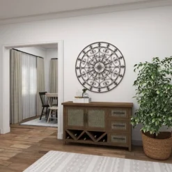 - •Round large metal wall art features a black finish which is best to pair with light-toned walls