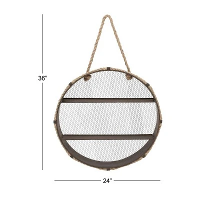 Display against a light-colored wall for the full industrial effect. This item ships in 1 carton. Can be hung horizontally using the jute rope; nails and screws not included. Suitable for indoor use only. This item ships fully assembled in one piece. Maximum weight limit is 20 lbs. This is a single black colored floating shelf. Metal wall shelf features 2 shelves. Industrial style.