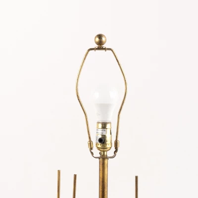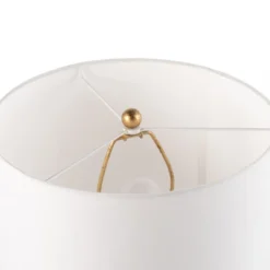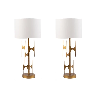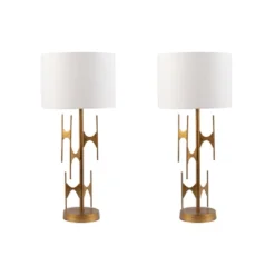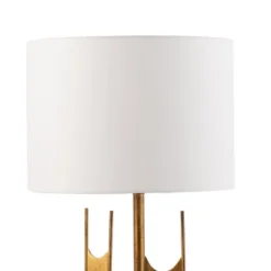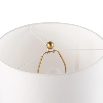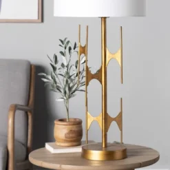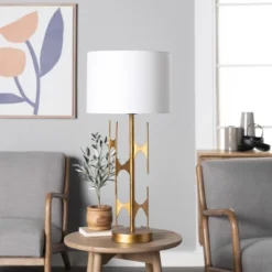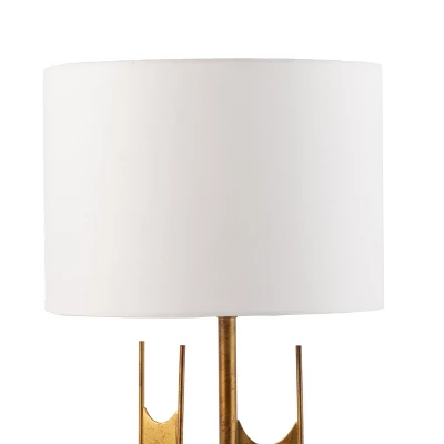 Embrace modern artistry with this gold-plated, 30-inch high table lamp. It has a 14-inch wide, cotton, ivory, drum lamp shade that delivers ambient lighting. The base is a sturdy pipe framed by artistic freeform shapes. Keeping in tune with its modern design, it has a clear lamp cord with an inline switch. To be used with a maximum 60-watt lightbulb. Light bulb not included..