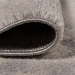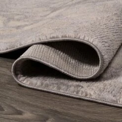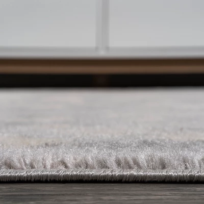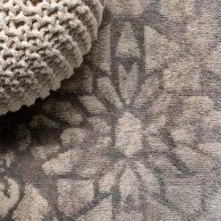 - Mingled shades of gray in the background give this rug a vintage texture; the pattern is woven in ivory
