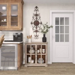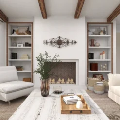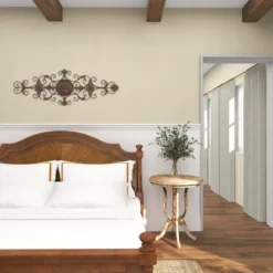 Hang this metal wall decor above a door or end table, or hang it parallel to a window or bookcase. This item ships in 1 carton. Full metal frame is designed with ornate detailed scrollwork. Can be hung horizontally or vertically using the keyholes on the back; nails and screws not included. Suitable for indoor use only. This item ships fully assembled in one piece. This is a single brown colored wall sculptures. Rustic style.