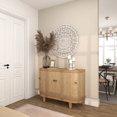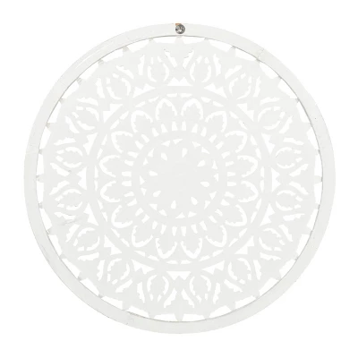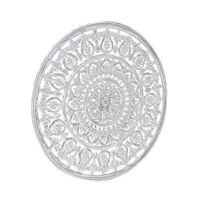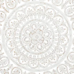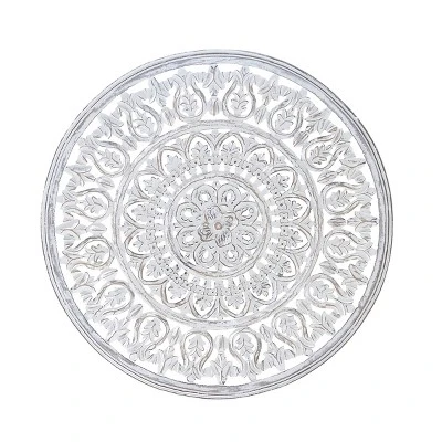 This carved wooden wall panel will work as a nice background or as a centerpiece when displayed on the walls of your traditional style inspired home. This item ships in 1 carton. Large, round, hand-carved wooden floral wall art. Due to the handmade nature of this item, no two will be alike, there will be slight differences in shape, size, and color. Can be hung vertically using the keyholes on the back; nails and screws not included. Suitable for indoor use only. This item ships fully assembled in one piece. Made in India. This is a single white colored wall sculptures. Traditional style.